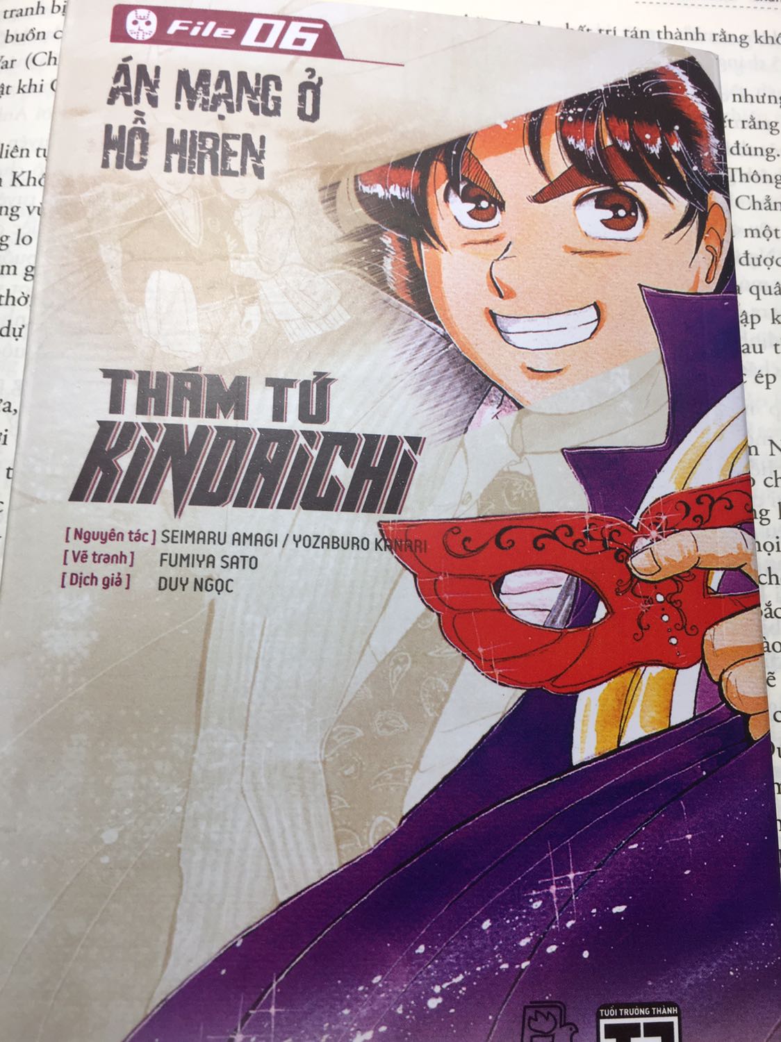 Thám Tử Kindaichi (Tập 6) – Án Mạng Ở Hồ Hiren Kindaichi Hajime (tên thường gọi là Kindaichi) là một cậu học sinh trung học ở trường LiTong nổi tiếng quậy quá, nghịch ngợm, chuyên đi học trễ nhưng luôn là học sinh đứng đầu lớp. Thực chất Kindaichi là một người có cá tính mạnh mẽ, rất thông minh (có chỉ số IQ là 180) cùng với những suy luận sắc bén vì cậu ta là người có một dòng máu “thiên tài” từ ông nội của mình là một nhà thám tử nổi tiếng đại tài Hajime. Kindaichi có một cô bạn gái thân với nhau từ nhỏ là Nanase Miyuki, một cô gái dễ thương có tính tình đáng yêu và được rất nhiều cậu con trai đào hoa phong nhả để ý nhưng cô chỉ luôn đi theo Kindaichi dù cậu ta là một người quậy phá, vô tích sự. Kindaichi cùng với cô bạn thân Miyuki luôn phiêu lưu vào những vụ án ghê rợn, đẫm máu và đầy bí ẩn thử thách của những kẻ giết người tàn ác. Hai viên cảnh sát thường có mặt trong truyện luôn được Kindaichi hỗ trợ phá án qua những vụ án mạng là Kenmochi Isamu và Akechi Kengo. Những tập truyện Kindaichi lôi cuốn người đọc với những vụ giết người huyền bí và những màn phá án tuyệt vời của một cậu học sinh trung học. Những vụ án trong truyện thường là những vụ giết người trong phòng kín hay trên đảo hoang với những manh mối đặc sắc kèm theo những lời bí ẩn để lại tại hiện trường và hung thủ là những người quen thuộc đồng hành từ đầu tập. Điều đáng chú ý ở Thám tử Kindaichi là kẻ giết người không bị tâm thần và những vụ giết người không vì lợi ích cá nhân. Những hung thủ bị vạch trần thường là do tổn thương nặng về tâm lí hoặc tình cảm vì nạn nhân gây ra cho mình trong quá khứ và có khi bắt nguồn từ lòng hận thù, ghen ghét đố kị, tham lam mù quáng, thói chuộng hư danh, ham muốn tiền tài vật chất… Nói chung tính chất tội phạm là do bắt nguồn từ ý muốn tham vọng cá nhân, thỏa mạn dục vọng thấp hèn của con người. Ngoài những vụ án li kì hấp dẫn hồi hộp qua những pha phá án sắc sảo, những tập truyện Thám tử Kindaichi còn giáo dục cho thanh niên sống ngày nay phải bằng chính năng lực của mình, sống đúng với pháp luật, tội ác luôn bị trừng trị và cộng lí công bằng trong xã hội. Tập 6 Được anh học của Miyuki nhờ vả, Kindaichi và Miyuki đã tham gia một tour du lịch thử nghiệm đến một resort cao cấp ở gần hồ Hiren. Trong lúc mọi người đang hào hứng thưởng thức bữa tiệc ngoài trời thì bỗng đâu một đài phát thanh đưa tin có một tên tử tội vượt ngục đang lảng vảng khu vực gần đó, khiến cảm giác bất an bao trùm lên mọi người. Và ngay sang hôm sau, một thành viên trong đoàn đã bị sát hại thảm khốc, khuôn mặt của nạn nhân bị rạch nát, y hệt như cách mà tên tử tội Jason đã từng ra tay với các nạn nhân trước kia của hắn!