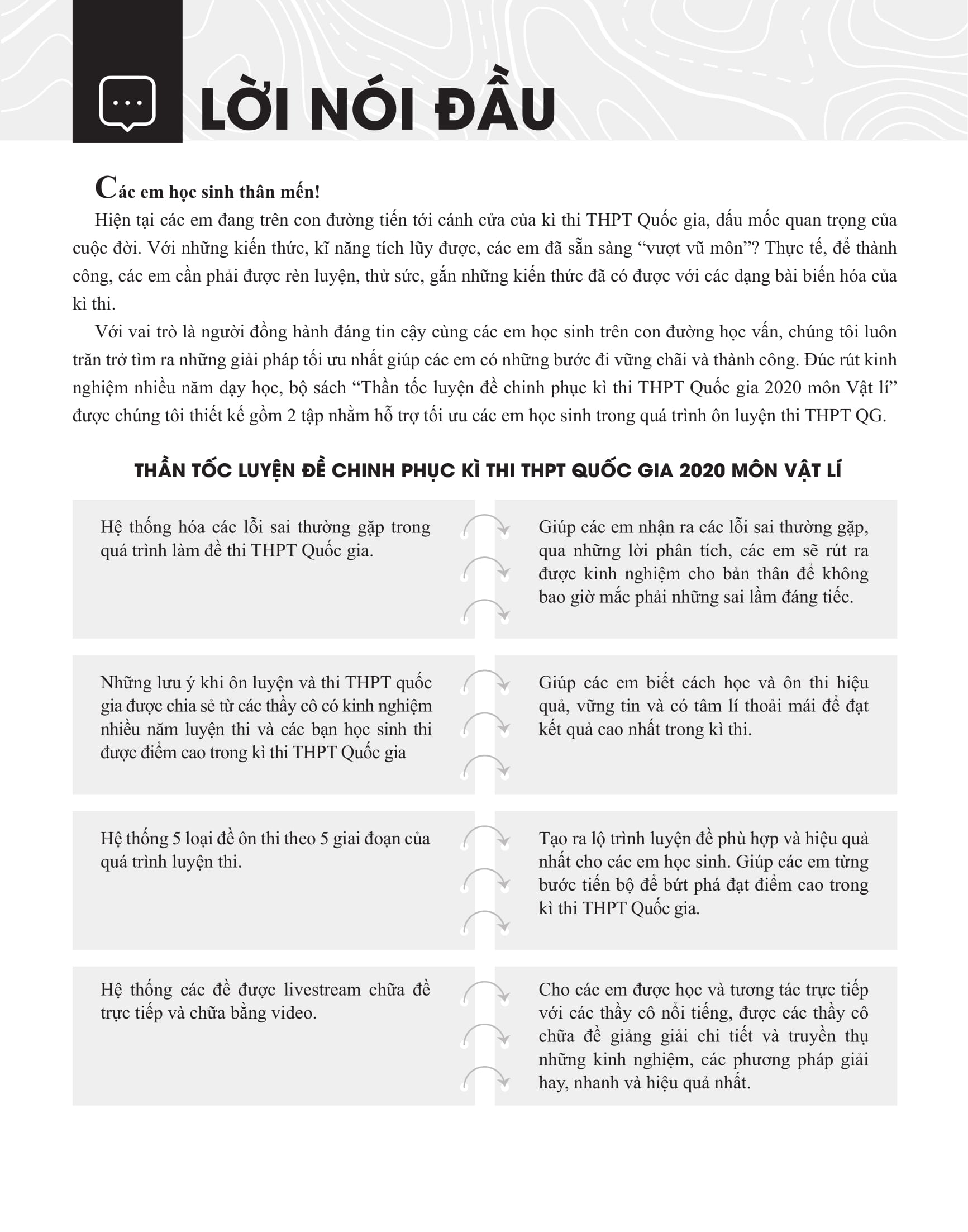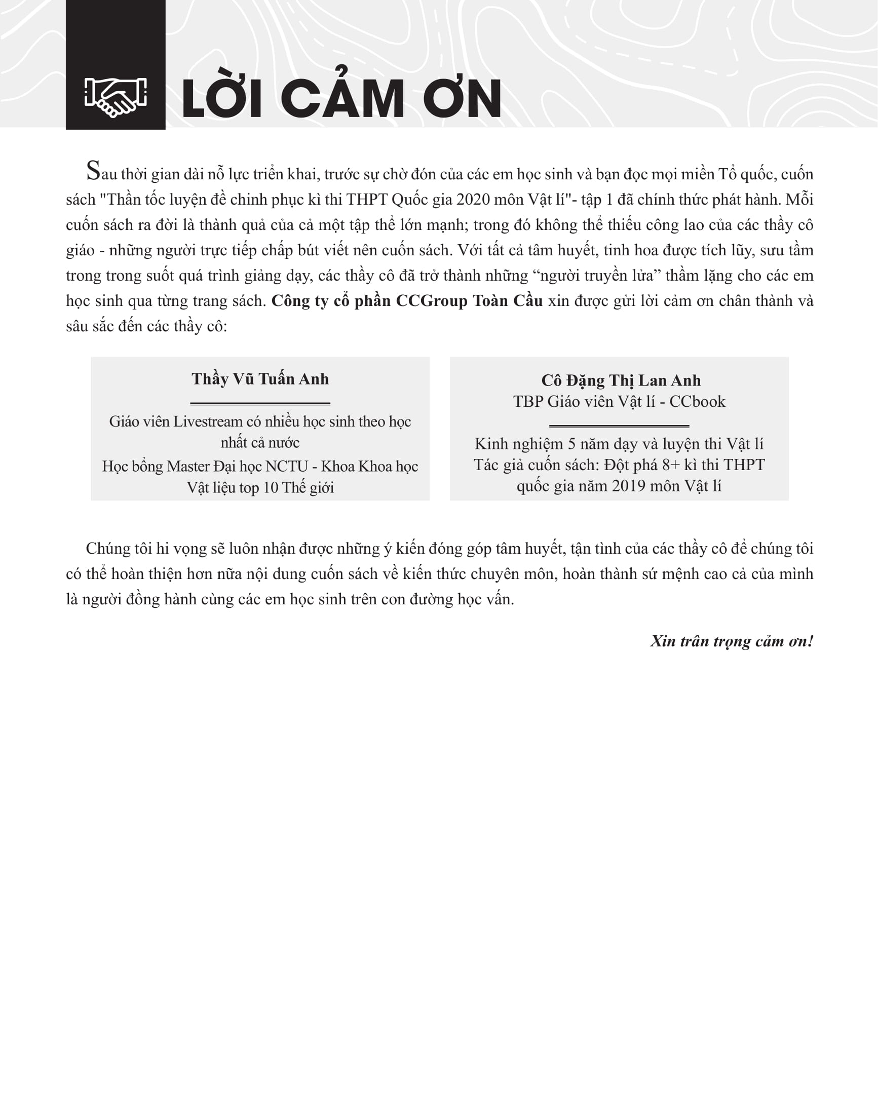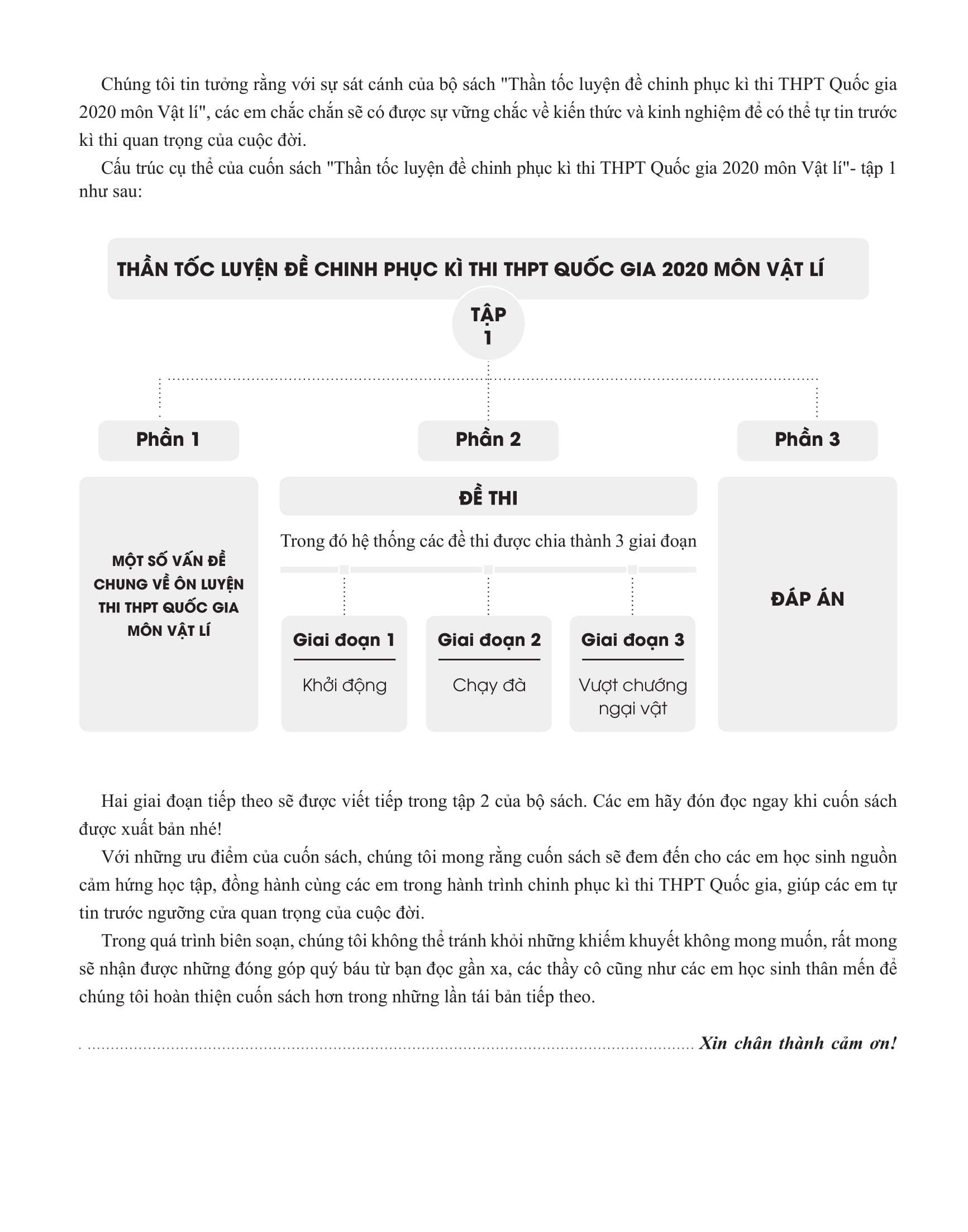 Nhằm mang đến cho các em học sinh một tài liệu ôn thi chất lượng, CCBOOK cho ra mắt cuốn sách “CC Thần tốc luyện đề 2020 môn Vật lí” (TẬP 1) Trong kì thi THPT Quốc gia 2020, thuộc tổ hợp 3 môn Khoa học tự nhiên, môn Vật lý tiếp tục được tổ chức thi với hình thức trắc nghiệm 100%. Nhằm mang đến cho các em học sinh một tài liệu ôn thi chất lượng, CCBOOK cho ra mắt cuốn sách “CC Thần tốc luyện đề 2020 môn Vật lí” (TẬP 1) Cuốn sách nằm trong bộ “CC Thần tốc luyện đề 2020” gồm trọn vẹn 8 môn thi của kì thi THPT Quốc gia (Toán, Ngữ văn, tiếng Anh, Vật lý, Hóa học, Sinh học, Lịch sử và Địa lý). Cuốn sách được chia làm 3 phần. Phần thứ nhất gồm Một số vấn đề chung về ôn luyện thi THPT Quốc gia. Phần thứ hai là bộ 25 đề thi được chia theo lộ trình 3 giai đoạn theo định hướng chi tiết. Phần cuối cùng là Đáp án chi tiết cho bộ đề. Nội dung cuốn sách “CC Thần tốc luyện đề 2020 môn Vật lí” (TẬP 1) Cuốn sách gồm có ba phần Phần thứ nhất: Một số vấn đề chung về luyện thi THPT Quốc gia Các Thầy Cô sẽ tổng hợp và hướng dẫn cách tránh mắc phải những lỗi sai thường gặp trong quá trình làm đề thi THPT Quốc gia môn Vật lý. Bao gồm những lỗi sau: Không đổi đơn vị, Hiểu sai hiện tượng, bản chất, Nhầm lẫn công thức tính, Lười tư duy giải nhanh, Lạm dụng sử dụng máy tính cầm tay, Cẩu thả trong cách tư duy, Nhầm lẫn nội dung bài toán,… Phần thứ hai: Bộ 25 đề thi THPT Quốc gia môn Vật lý Cuốn sách có tổng cộng 25 đề thi, được chia làm 3 phần, tương ứng với lộ trình 3 giai đoạn ôn thi THPT Quốc gia: Khởi động, chạy đà và vượt chướng ngại vật + Giai đoạn 1 – Khởi động. Gồm 5 đề. Với cuốn sách “CC Thần tốc luyện đề 2020 môn Vật lí” (TẬP 1) các em có thể ngay lập tức bước vào giai đoạn luyện đề từ cuối tháng 11 đến cuối tháng 12. Trong vòng 1 tháng, học sinh sẽ làm quen với các đề thi dưới dạng đề ôn luyện cuối học kì 1. + Giai đoạn 2 – Chạy đà. Gồm 10 đề. Bước sang giai đoạn thứ hai, các em sẽ chính thức bước vào quá trình luyện đề thi THPT Quốc gia 2020. Ở giai đoạn này, đề thi được xây dựng theo cấu trúc với mức độ khó thấp hơn đề thi thật (đề nằm ở mức 7, 8 điểm) để củng cố kiến thức cơ bản, chuẩn bị cho giai đoạn 3. + Giai đoạn 3 – Vượt chướng ngại vật. Gồm 10 đề. Các em sẽ luyện tập với những đề có mức độ khó tương đương với đề thi thật. Qua đó, từng bước làm quen với áp lực của kì thi THPT Quốc gia, nâng cao kỹ năng làm đề trắc nghiệm nhanh và xử lý những đề thi khó hơn ở mức điểm 9 – 10. Đặc biệt, mỗi đề thi đều có kèm với phiếu tô đáp án trắc nghiệm được thiết kế như tờ phiếu thi chính thức. Các em có thể dễ dàng cắt chúng ra và luyện tập làm đề thi ngay trên chúng Phần thứ 3: Đáp án Các đề thi trong sách đều có lời giải chi tiết dưới 3 dạng: đề có đáp án chi tiết, đề có bảng đáp án và đề được chữa livestream Đề có đáp án chi tiết từng câu: Các bài tập tính toán sẽ được giải từng bước để học sinh dễ dàng nắm được cách thức. Các câu hỏi lý thuyết cũng sẽ được phân tích đúng – sai, giúp các em củng cố những kiến thức căn bản, đặc biệt là những phần học sinh hay nhầm lẫn Đề có bảng đáp án: Mỗi đề này đều có kèm theo chuỗi video chữa đề do chính tác giả – thầy cô giáo quay. Không chỉ có đáp án mà các Thầy Cô sẽ chia sẻ những cách khắc phục lỗi sai, mẹo giải nhanh để học sinh tối ưu phương pháp và thời gian làm bài Đề được chữa livestream: Đề thi sẽ được thầy Vũ Tuấn Anh – Học bổng Master Đại học NCTU (Top 10 thế giới khoa Khoa học vật liệu), Giáo viên livestream có nhiều học sinh theo học nhất cả nước – livestream chữa chi tiết từng câu. Các em có thể tìm kiếm và theo dõi trang cá nhân của thầy Vũ Tuấn Anh theo đường link dưới đây hoặc tìm theo tên: Vu Tuan Anh (Thầy dạy Vật Lý) để được thông báo về lịch livestream chữa đề nhé. Ưu điểm nổi bật của cuốn sách “CC Thần tốc luyện đề 2020 môn Vật lí” (TẬP 1) Khác hẳn với những cuốn luyện đề trên thị trường, “CC Thần tốc luyện đề 2020 môn Vật lí” được thiết kế theo lộ trình 3 giai đoạn rõ ràng với định hướng chi tiết cho mỗi giai đoạn. Mỗi bộ đề tương ứng với một giai đoạn sẽ giúp các em chinh phục những mục tiêu trong quá trình luyện đề thi THPT Quốc gia 2020. Tất cả 25 đề thi thuộc 3 giai đoạn đều có đáp án chi tiết từng bước (kể cả các câu lý thuyết cũng sẽ được giải thích cặn kẽ). Trong đó: Giai đoạn 1 – Khởi động: gồm 4 đề có lời giải trong sách và 1 đề được hướng dẫn giải chi tiết qua livestream do thầy giáo Vũ Tuấn Anh – Chuyên gia luyện thi Đại học môn Vật lý hướng dẫn Giai đoạn 2 – Chạy đà và Giai đoạn 3 – Vượt chướng ngại vật: Mỗi giai đoạn sẽ gồm 5 đề có lời giải tro
