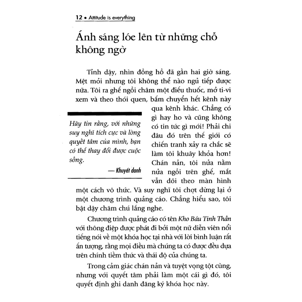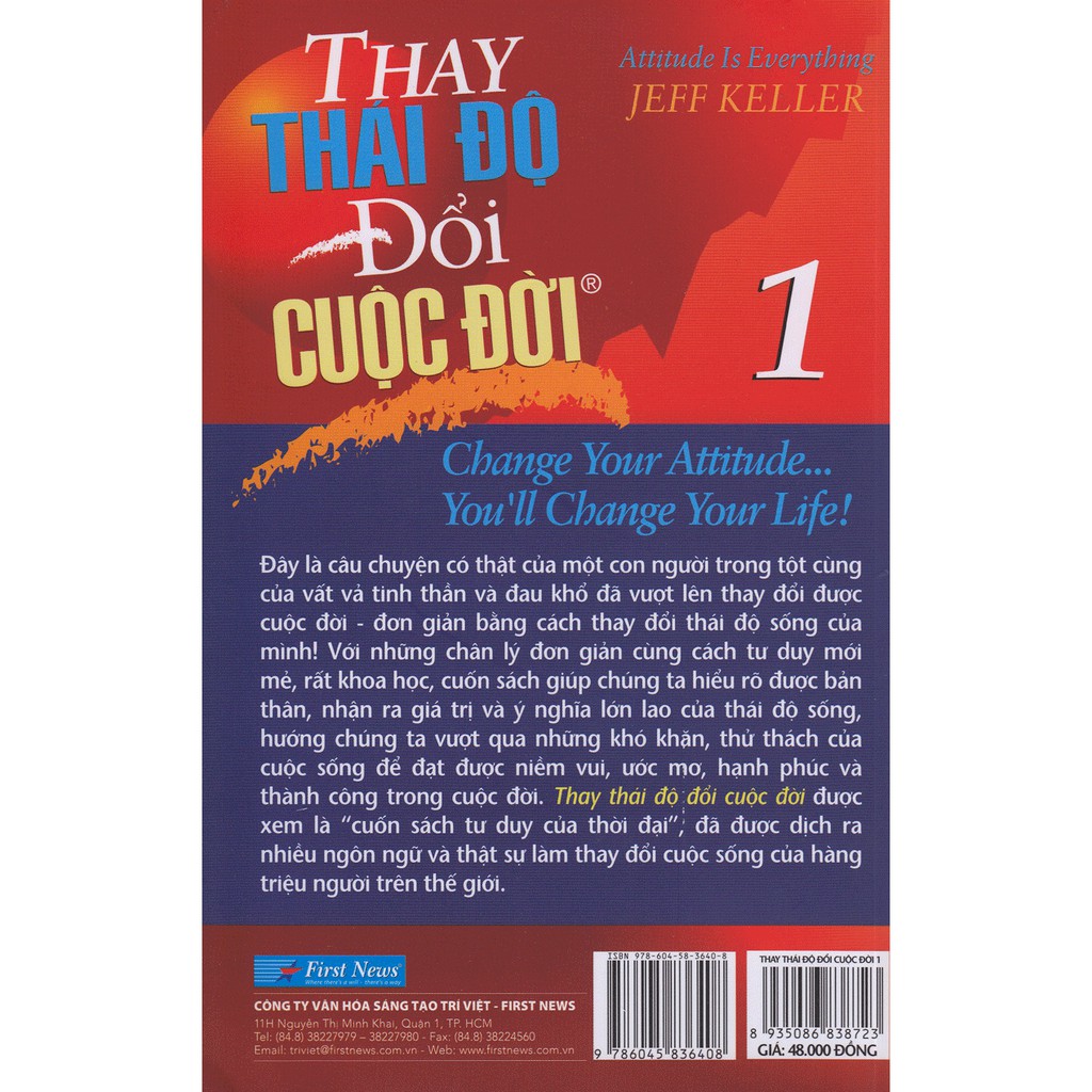 THÔNG TIN CHI TIẾT Công ty phát hành First News – Trí Việt Tác giả Jeff Feldhahn Ngày xuất bản 05-2016 Kích thước 13 x 20.5 cm Nhà xuất bản Nhà Xuất Bản Tổng hợp TP.HCM Dịch Giả First News Loại bìa Bìa mềm Số trang 189 GIỚI THIỆU SÁCH Thay Thái Độ Đổi Cuộc Đời – Tập 1 “Người hạnh phúc không phải là người được sống trong hoàn cảnh thuận lợi nào mà là một người có cách nhìn và thái độ sống tốt nhất trong mọi hoàn cảnh.” (Hugh Downs) Thay thái độ Đổi cuộc đời kể về một câu chuyện có thật và là bức thông điệp tâm huyết từ một người đã từng gặp những khó khăn, vất vả về mặt vật chất và tinh thần – người đã rơi vào tận cùng của đau khổ, bế tắc, chán nản, mất niềm tin cuộc sống nhưng đã tìm cách vượt lên để thay đổi cuộc đời mình đơn giản bằng cách thay đổi thái độ sống. Bằng sự trải nghiệm của bản thân, tác giả đã chứng minh một chân lý có thật trong cuộc sống đó là: Thái độ sống là tất cả, thái độ sống đóng vai trò rất quan trọng đến sự thành bại của từng người. Trong khi người tiêu cực luôn nhìn đời bằng con mắt chán chường, bi quan, thất vọng thì người tích cực luôn nhìn cuộc sống bằng lăng kính lạc quan, biết thay đổi suy nghĩ, biết vạch ra mục tiêu và kiên trì theo đuổi mục tiêu, biết biến trở ngại thành cơ hội, biến bất hạnh thành may mắn. Và kết quả tận cùng của hai thái độ đó rất khác biệt. Người có thái độ sống tích cực luôn nhìn thấy các khả năng và tìm ra những con đường chưa thành lối để đạt đến thành công, hạnh phúc thật sự. Còn người có thái độ sống tiêu cực thì tự giam hãm cuộc sống mình vào các khuôn khổ, lối mòn và chỉ nhìn thấy các giới hạn, khó khăn trong cuộc sống….////
