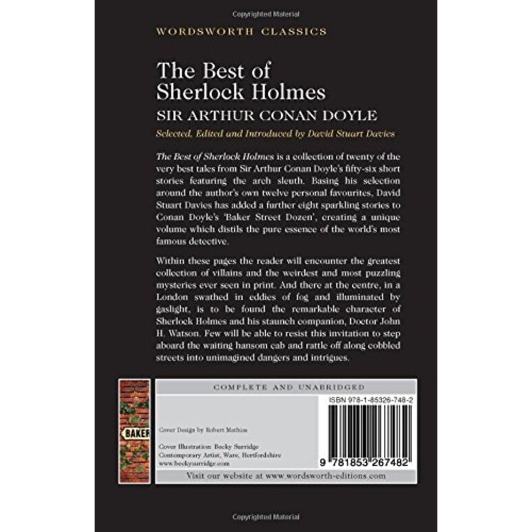 Thông tin sản phẩm : Tác giả: Sir Arthur Conan Doyle Nhà Xuất bản : Wordsworth Editions Ltd Nhà phát hành: Wordsworth Editions Ltd Năm xuất bản: 1998 Ngôn ngữ : Tiếng Anh Số trang: 462 ISBN: 9781853267482 Nội dung: The Best of Sherlock Holmes is a collection of twenty of the very best tales from Sir Arthur Conan Doyle’s fifty-six short stories featuring the arch sleuth. Basing his selection around the author’s own twelve personal favorites, David Stuart Davies has added a further eight sparkling stories to Conan Doyle’s ‘Baker Street Dozen’, creating a unique volume which distills the pure essence of the world’s most famous detective. Within these pages, the reader will encounter the greatest collection of villains and the weirdest and most puzzling mysteries ever seen in print. And there at the center, in a London swathed in eddies of fog and illuminated by gaslight, is to be found the remarkable character of Sherlock Holmes and his staunch companion, Doctor John H. Watson. Few will be able to resist this invitation to step aboard the waiting hansom cab and rattle off along cobbled streets into unimagined dangers and intrigues. Sherlock Holmes là tiểu thuyết của Sir Arthur Conan Doyle lần đầu xuất hiện vào năm 1887 trong cuốn tiểu thuyết trinh thám “A Study in Scarlet”. Từ đó, nhà văn Anh đã viết 4 tiểu thuyết và 55 truyện ngắn về Holmes. Qua hàng thế kỷ, vị thám tử đã trở thành một biểu tượng văn hóa và là nguồn cảm hứng của rất nhiều cây bút khác. Tuyển tập bao gồm 20 vụ án được nổi tiếng và được yêu thích nhất của Sherlock Holmes như: A Scandal in Bohemia, The Dancing Man, The Red-Headed League, The Final Problem, …