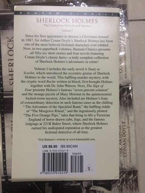 Thông tin sách: ISBN: 9780553212419 NXB: Random House Tác giả: Sir Arthur Conan Doyle Năm XB: 01/12/1986 Trọng lượng (gr) : 408 Kích thước: 17.4 x 4.4 x 10.7 Số trang :1088 Hình thức : Bìa Mềm Ngôn ngữ: Sách Tiếng Anh Giới Thiệu Nội Dung Sách: Sherlock Holmes: The Complete Novels and Stories Volume I Since his first appearance in Beeton’s Christmas Annual in 1887, Sir Arthur Conan Doyle’s Sherlock Holmes has been one of the most beloved fictional characters ever created. Now, in two paperback volumes, Bantam presents all fifty-six short stories and four novels featuring Conan Doyle’s classic hero–a truly complete collection of Sherlock Holmes’s adventures in crime! Volume I includes the early novel A Study in Scarlet, which introduced the eccentric genius of Sherlock Holmes to the world. This baffling murder mystery, with the cryptic word Rache written in blood, first brought Holmes together with Dr. John Watson. Next, The Sign of Four presents Holmes’s famous “seven percent solution” and the strange puzzle of Mary Morstan in the quintessential locked-room mystery. Also included are Holmes’s feats of extraordinary detection in such famous cases as the chilling “ The Adventure of the Speckled Band,” the baffling riddle of “The Musgrave Ritual,” and the ingeniously plotted “The Five Orange Pips,” tales that bring to life a Victorian England of horse-drawn cabs, fogs, and the famous lodgings at 221B Baker Street, where Sherlock Holmes earned his undisputed reputation as the greatest fictional detective of all time.