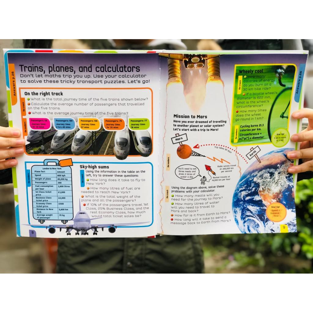 Giải toán với máy tính bỏ túi được xem là một phương pháp làm toán, giúp trẻ sáng tạo trong cách học tập để tìm ra đáp án nhanh và chính xác nhất. The_Maths_Calculator_Book sẽ là 1 cuốn sổ tay tiện dụng cung cấp những thông tin vô cùng bổ ích để hướng dẫn trẻ giải Toán bằng máy tính thông qua – Hàng trăm các bài toán thực tế – Hàng trăm những câu đố khó nhằn và hack não thú vị. – Hình ảnh thật và vô cùng sinh động. Bố mẹ tham khảo một số nội dung trang sách sẽ thấy nhé. Cuốn sách xây dựng các kỹ năng suy luận và giải quyết vấn đề của con bạn với các vấn đề thực tế – câu đố toán học – các trò chơi và hoạt động để tính toán. Làm quen với các con số và tìm hiểu Toán học từ căn bản Đặc biệt, các câu đố, các bài Toán gắn liền với cuộc sông thường ngyà sẽ cho các bé cảm thấy Toán học vô cùng gần gũi, thú vị và không hề khô khan chút nào đâu ạ. Biết tiếng Anh không chưa đủ, am hiểu kiến thức, thành thạo kỹ năng thông qua ngôn ngữ quốc tế này mới là đích thực sự cần đến. Vừa học Toán vừa thực hành như vậy ai còn bảo sách Tiếng anh chỉ học tiếng anh, con còn được khám phá rất nhiều kiến thức Toán học bổ ích lại trau dồi thêm vốn kiến thức thực tế nữa đó ạ. ———————– Mở sách ra để con hoàn thành hành trình Toán học cùng chiếc máy tính này ngay thôi. Sách bìa cứng khổ to + 1 máy tính cầm tay đẹp như hình bố mẹ nhé.