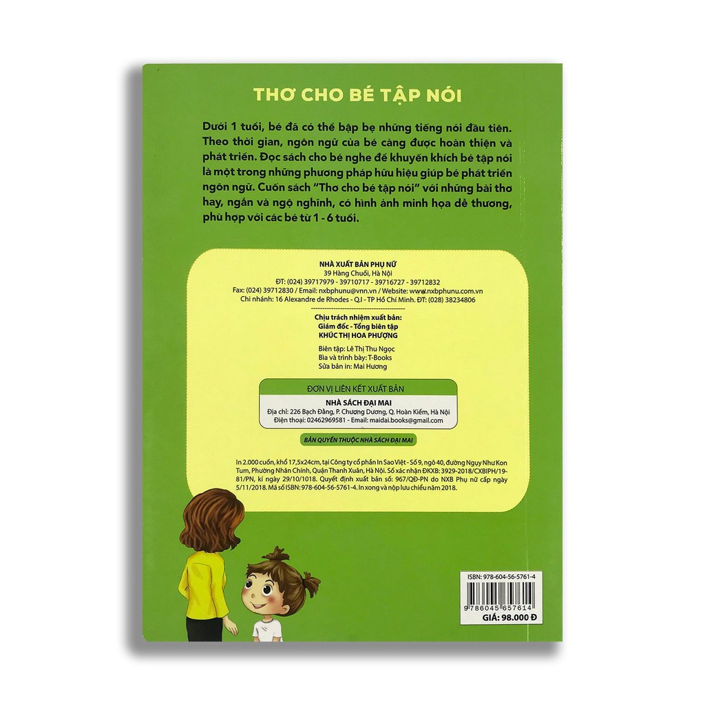 Thơ Cho Bé Tập Nói (bìa cứng) Giúp bé phát triển ngôn ngữ, khả năng nghe hiểu, khả năng nhận biết, Dưới 1 tuổi, bé đã có thể bập bẹ những tiếng nói đầu tiên. Theo thời gian, ngôn ngữ của bé ngày càng được hoàn thiện và phát triển. Đọc sách cho bé nghe để khuyến khích bé tập nói là một trong những phương pháp hữu hiệu giúp bé phát triển ngôn ngữ, Cuốn sách ” Thơ cho bé tập nói ” với những bài thơ hay, ngắn gọn và ngộ nghĩnh, có hình ảnh minh họa dễ thương, phù hợp với các bé từ 1 – 6 tuổi. Mục lục: -Thiên nhiên tươi đẹp -Loài vật bé yêu -Bé ở nhà và ở trường ————– Công ty phát hành Đại Mai Nhà xuất bản NXB Phụ Nữ Tác giả Hải Minh Ngày xuất bản 10-2018 Kích thước 17.5×24 cm Nhà xuất bản Nhà Xuất Bản Phụ Nữ Loại bìa Bìa cứng Số trang 36
