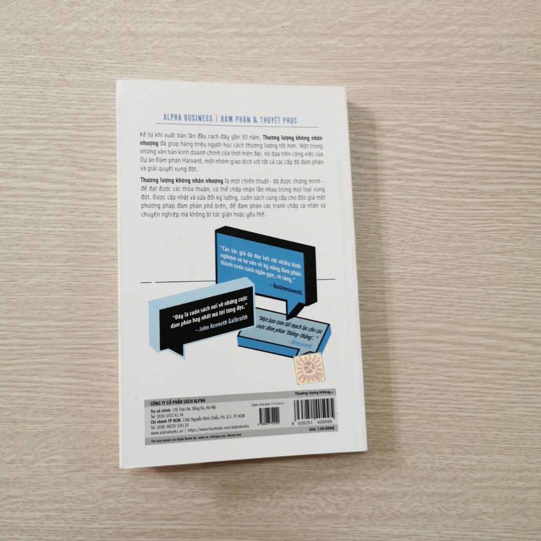 Sách Thương Lượng Không Nhân Nhượng, Tác giả: Roger Fisher, William Ury, Bruce Patton, Công ty phát hành Alphabooks Ngày xuất bản 01-2019 Kích thước 13 x 20,5 cm Loại bìa Bìa mềm SKU 3212277233136 Nhà xuất bản Nhà Xuất Bản Thế Giới.