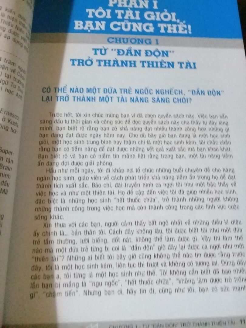 TIKI KHUYÊN ĐỌC ĐÁNH GIÁ SÁCH TÔI TÀI GIỎI, BẠN CŨNG THẾ ! TỪ TIKI.VN: Khi bạn cầm trên tay quyển sách này, có nghĩa là bạn đã có chiếc chìa khóa đến sự thành công cùng bảng hướng dẫn sử dụng. Trong chúng ta, bất kỳ ai cũng muốn chính bản thân mình trở thành người tài giỏi, có thể giải quyết mọi vấn đề một cách hiệu quả nhất. Và để có được những điều đó quyển sách này sẽ giúp bạn bằng những hướng dẫn học tập chi tiết nhất. Tác giả không chỉ đơn thuần giải thích người khác đã thành công như thế nào, mà còn nói làm sao để họ làm được như thế để giúp người đọc khám phá ra tiềm năng của bản thân, và phát huy điều đó. Ngoài ra, sách còn cung cấp những phương pháp học thông minh (như áp dụng các công cụ học bằng cả não bộ như Sơ Đồ Tư Duy, phát triển trí nhớ siêu việt để ghi nhớ các sự kiện, con số một cách dễ dàng, thành thạo việc quản lý thời gian và xác định mục tiêu). Adam Khoo đã cho thấy, tài giỏi mang lại sự tự tin như thế nào và còn hướng dẫn bạn cách thức trở thành người tài giỏi. Qua đó độc giả sẽ lập được kế hoạch cho cuộc đời của chính mình. Tôi Tài Giỏi – Bạn Cũng Thế sẽ giúp tìm ra giải pháp tốt nhất cho mọi vấn đề, và giúp nhận ra cách thức để thành công. Tuy nhiên để làm một người tài giỏi thì người đọc cần đặt quyển sách xuống và thực thi ngay các kế hoạch. Đương nhiên, không phải chỉ chăm chỉ ngày một, ngày hai mà mỗi người phải thực hiện lâu dài, thậm chí cả đời thì mới đạt được những gì mình muốn. Thật sự đây là một quyển sách rất tuyệt vời và bổ ích, đem lại cho chúng ta những kinh nghiệm quý báu. Một quyển sách không – thể – thiếu trong tủ sách! © “Thật không biết phải làm sao với con trai chúng tôi. Nó được gởi đi học thêm khắp nơi mà vẫn làm bài thi tệ hại. Chúng tôi tự hỏi sau này nó có làm nên trò trống gì không nữa”… Đó chính là những gì mà cha mẹ của Adam Khoo đã từng than vãn về sự kém cõi và kết quả thi cử thảm hại của cậu bé Adam nhiều năm về trước. May mắn thay, vào thời điểm tăm tối nhất trong đời, Adam đã tìm thấy và học tập theo công thức thành công của những người tài giỏi vượt bậc. Chính vì thế, từ một cậu học trò kém cỏi nhất trong số những học sinh kém, không những anh đã vươn lên để đạt đuợc kết quả xuất sắc trong các kỳ thi cuối cấp hai và cấp ba, anh còn đuợc xếp hạng trong số 1% sinh viên tài năng nhất của trường Đại học Quốc Gia Singapore (NUS). Tôi tài giỏi, bạn cũng thế ! tổng hợp những kỹ năng và phương pháp đã mang tới thành công vượt bậc cho cậu bé Adam kém cõi và dĩ nhiên bạn cũng có thể thành công như vậy! Quyển sách này dành cho các học sinh, sinh viên, các bậc phụ huynh, các nhà giáo và bất kỳ ai luôn mong muốn tăng cường khả năng tận dụng não bộ hoặc phát huy tối đa tiềm năng của mình. Nếu bạn muốn “tài giỏi” trong các phương pháp học tập và suy nghĩ vượt bậc, hãy đọc quyển sách này. Bạn sẽ học đuợc cách: Tăng cường sự tự tin và làm chủ cuộc sống của bạn Áp dụng các công cụ học bằng cả não bộ như Sơ Đồ tư Duy Phát huy trí nhớ siêu việt để nhớ lại các sự kiện, con số một cách dễ dàng Thành thạo việc quản lý thời gian và xác định mục tiêu Mang lại khả năng đạt được những thành tích cao nhất có thể Áp dụng các phương pháp thi cử hiệu quả để “chiến đấu” và “Chiến thắng” trong các kỳ thi quan trọng. Tài năng đặc biệt của Adam nằm ở việc anh có thể hệ thống và chia sẻ các kỹ thuật và phương pháp mà bất kỳ học sinh nào cũng có thể áp dụng để đạt được những kết quả xuất sắc như anh đã từng đạt được. Mục Lục Sách Tôi Tài Giỏi, Bạn Cũng Thế ! Lời mở đầu của Tony Buzan và Ernest Wong Phần 1: Tôi tài giỏi, bạn cũng thế! Chương 1: Từ đần độn trở thành thiên tài Chương 2: Quá trình học tập hiệu quả Chương 3: Bạn đã sẵn sàng để thành công chưa? Chương 4: Tôi tin tôi có thể bay cao… và tôi làm được Phần 2: Những phương pháp học siêu đẳng Chương 5: Bạn sở hữu bộ não của một thiên tài Chương 6: Phương pháp đọc để nắm bắt thông tin Chương 7: Sơ đồ tư duy: Công cụ ghi chú tối ưu Chương 8: Trí nhờ siêu đẳng dành cho từ Chương 9: Trí nhớ siêu đẳng dành cho số Chương 10: Mô hình trí nhớ Chương 11: Nghệ thuật ứng dụng lý thuyết vào thực hành Phần 3: Động lực cá nhân của bạn Chương 12: Dám mơ ước: Sức mạnh của mục tiêu Chương 13: Động lực mạnh mẽ – vượt qua sự lười biếng Chương 14: Công thức để đạt điểm tuyệt đối Chương 15: Thời gian là tiền bạc Chương 16: Tạo quyết tâm mạnh mẽ tức thì Phần 4: Phương pháp thi cử Chương 17: Tăng tốc về đích Chương 18: Chiến thắng và vinh quang. Mời bạn đón đọc.