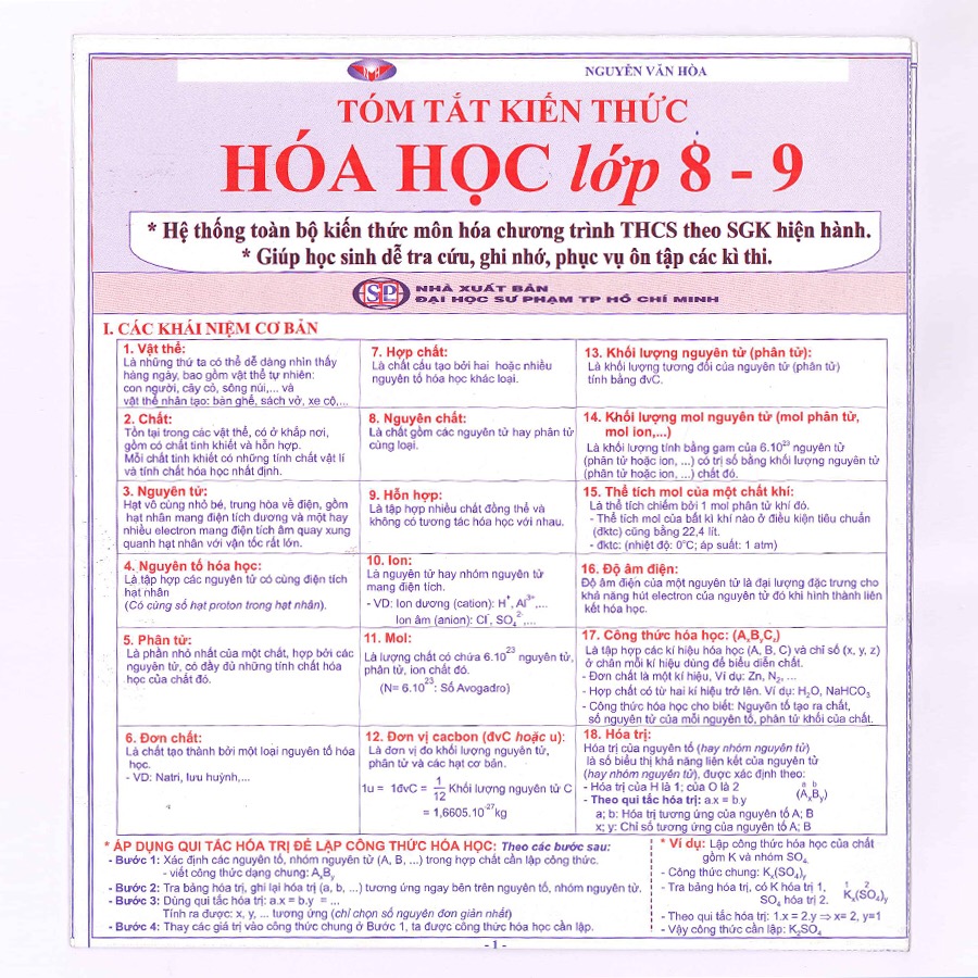 Sách Tóm tắt kiến thức Hóa Học lớp 8 – 9, Tác giả: Nguyễn Văn Hòa, Công ty phát hành Công ty TNHH Đầu Tư Sáng Tạo Ngày xuất bản 10-2018 Kích thước 39 x 54 (cm) Loại bìa Bìa mềm Số trang 12 SKU 3880929186545 Nhà xuất bản Nhà Xuất Bản Đại Học Sư Phạm TPHCM.