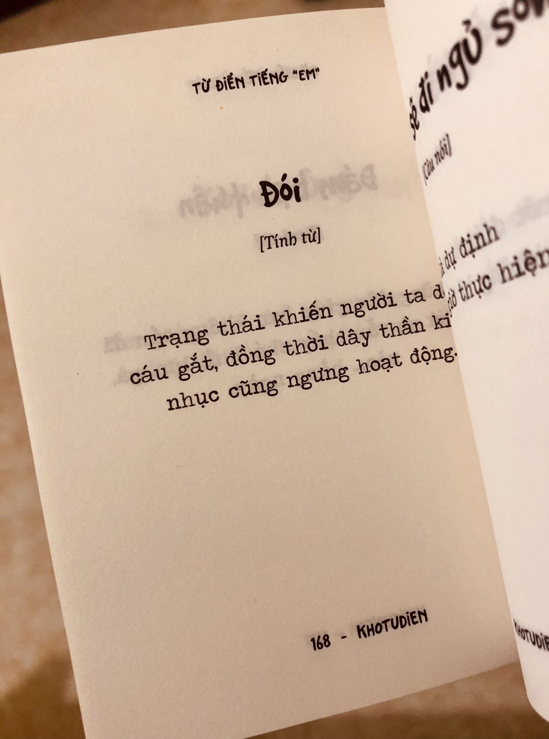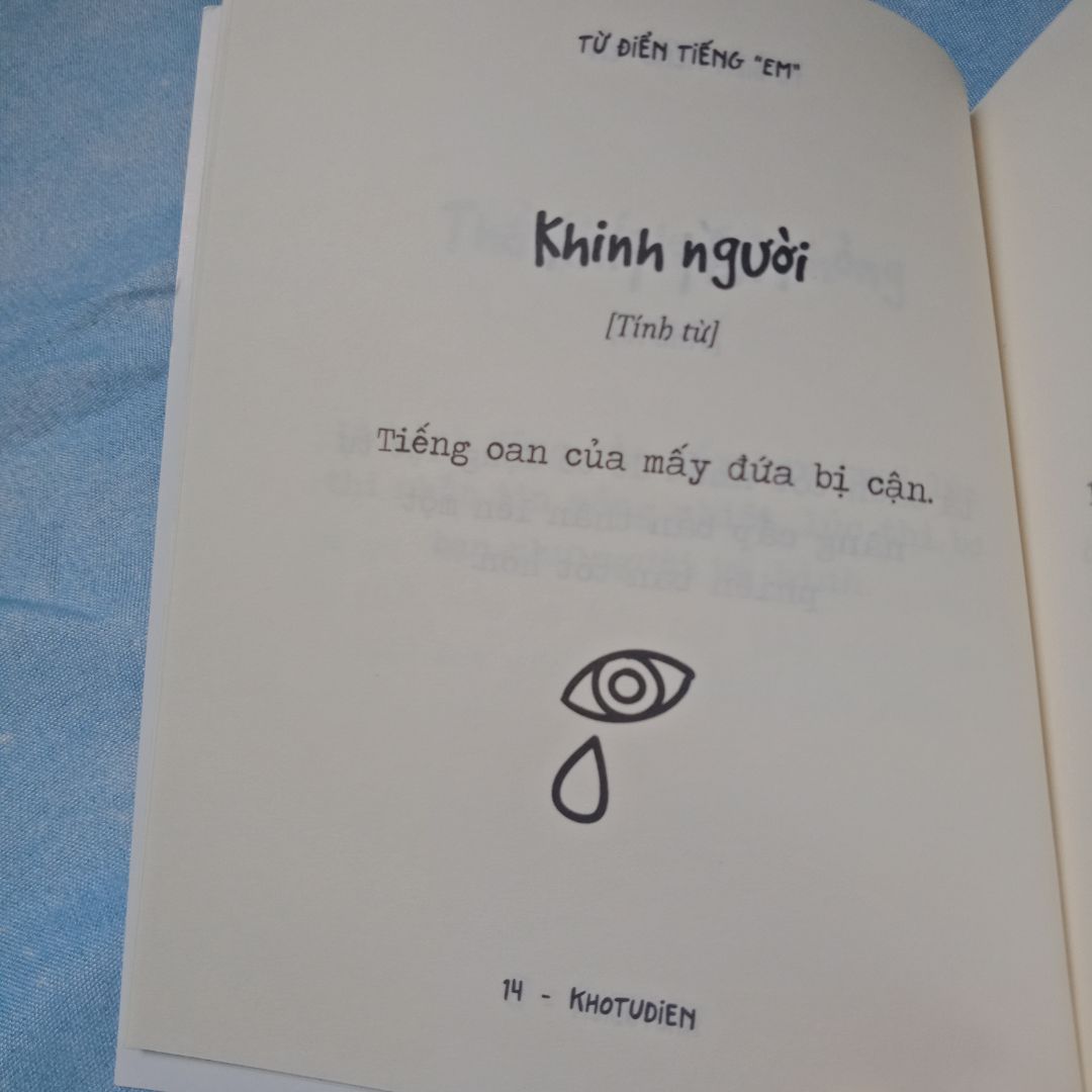 TỪ ĐIỂN TIẾNG “EM” – Định nghĩa về thế giới mới! Bạn sẽ bất ngờ, khi cầm cuốn “từ điển” xinh xinh này trên tay. Và sẽ còn ngạc nhiên hơn nữa, khi bắt đầu đọc từng trang sách… Dĩ nhiên là vì “Từ điển tiếng “Em” không phải là một cuốn từ điển thông thường rồi! Nói đến “từ điển”, xưa nay chúng ta đều nghĩ về một bộ sách đồ sộ, giải thích ý nghĩa, cách dùng, dịch, cách phát âm, và thường kèm theo các ví dụ về cách sử dụng từ đó. Tuy nhiên, với cuốn sách “Từ điển tiếng “em”, các bạn sẽ hết sức bất ngờ với những định nghĩa mới, bắt trend, sáng tạo, thông minh và vô cùng hài hước. Tiếng “em” [danh từ] ở đây là tiếng lòng của những người yêu sự thật, ghét sự giả dối Cô đơn [ tính từ ] không phải là không có ai bên cạnh, mà là người mình muốn ở cạnh lại không hề ở bên Sống lỗi [ động từ ] là cách sống của mấy bạn có người yêu cái là bỏ bê bạn bè liền hà Nhưng đây không chỉ là cuốn sách chỉ biết nói dăm ba câu chuyện về tình yêu. Còn nhiều hơn thế! Là những câu cửa miệng của giới trẻ thời nay; là hoạt động tưởng vô bổ nhưng cần thiết cho sự sống: ăn, ngủ, tắm, gội cũng được định nghĩa hết sức dí dỏ Và cũng không thiếu những “tật xấu, thói hư” nghĩ đến đã thấy “tức cái lồng ngực” Và bạn yên tâm, “tập đoàn” Kho Từ Điển điều hành bởi Thịt Kho – Hiệp Thị – 2 chủ xị cho ra đời cuốn sách nhỏ bé xíu xiu nhưng mới mẻ và mặn mà vô cùng này sẽ khiến bạn thoát mác “người tối cổ” cười cả ngày không chán, nhìn bạn bè quanh mình bằng ánh mắt dễ thương, tận hưởng cuộc đời với những định nghĩa hoàn toàn!!! Cuốn sách này giống như một chiếc hộp Pandora thú vị và hấp dẫn người đọc, vì bạn không thể đoán trước được tác giả sẽ “định nghĩa” câu nói đó theo nghĩa nào, cho ta thêm thích thú với những ngôn từ đáng yêu sử dụng mỗi ngày. Vậy nên, ngay bây giờ, bạn đã sẵn sàng để mở ra những điều thú vị trong cuốn sách này chưa!!!