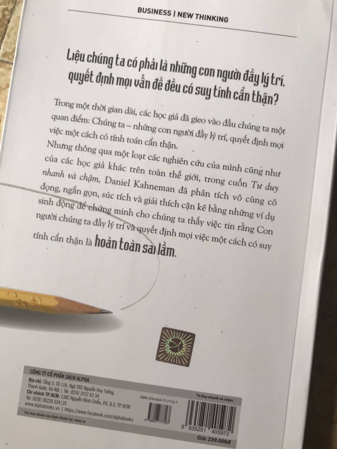 Tư Duy Nhanh Và Chậm (Tái Bản 2019) Chúng ta thường tự cho rằng con người là sinh vật có lý trí mạnh mẽ, khi quyết định hay đánh giá vấn đề luôn kĩ lưỡng và lý tính. Nhưng sự thật là, dù bạn có cẩn trọng tới mức nào, thì trong cuộc sống hàng ngày hay trong vấn đề liên quan đến kinh tế, bạn vẫn có những quyết định dựa trên cảm tính chủ quan của mình. “Tư duy nhanh và chậm”, cuốn sách nổi tiếng tổng hợp tất cả nghiên cứu được tiến hành qua nhiều thập kỷ của nhà tâm lý học từng đạt giải Nobel Kinh tế Daniel Kahneman sẽ cho bạn thấy những sư hợp lý và phi lý trong tư duy của chính bạn. Cuốn sách được đánh giá là “kiệt tác” trong việc thay đổi hành vi của con người, Tư duy nhanh và chậm đã dành được vô số giải thưởng danh giá, lọt vào Top 11 cuốn sách kinh doanh hấp dẫn nhất năm 2011. Alpha Books đã mua bản quyền và sẽ xuất bản cuốn sách trong Quý 1 năm nay. Tư duy nhanh và chậm dù là cuốn sách có tính hàn lâm cao nhưng vô cùng bổ ích với tất cả mọi người và đặc biệt rất dễ hiểu và vui nhộn. Đã có rất nhiều cuốn sách nói về tính hợp lý và phi lý của con người trong tư duy, trong việc đánh giá và ra quyết định, nhưng Tư duy nhanh và chậm được Tạp chí Tài chính Mỹ đánh giá là “kiệt tác”. Bạn nghĩ rằng bạn tư duy nhanh, hay chậm? Bạn tư duy và suy nghĩ theo lối “trông mặt bắt hình dong”, đánh giá mọi vật nhanh chóng bằng cảm quan, quyết định dựa theo cảm xúc hay tư duy một cách cẩn thận, chậm rãi nhưng logic hợp lý về một vấn đề. Tư duy nhanh và chậm sẽ đưa ra và lý giải hai hệ thống tư duy tác động đến con đường nhận thức của bạn. Kahneman gọi đó là: hệ thống 1 và hệ thống 2. Hệ thống 1, còn gọi là cơ chế nghĩ nhanh, tự động, thường xuyên được sử dụng, cảm tính, rập khuôn và tiềm thức. Hệ thống 2, còn gọi là cơ chế nghĩ chậm, đòi hỏi ít nỗ lực, ít được sử dụng, dùng logic có tính toán và ý thức. Trong một loạt thí nghiệm tâm lý mang tính tiên phong, Kahneman và Tversky chứng minh rằng, con người chúng ta thường đi đến quyết định theo cơ chế nghĩ nhanh hơn là ghĩ chậm. Phần lớn nội dung của cuốn sách chỉ ra những sai lầm của con người khi suy nghĩ theo hệ thống 1. Kahneman chứng minh rằng chúng ta tệ hơn những gì chúng ta tưởng: đó là chúng ta không biết những gì chúng ta không biết! Cuốn sách đặc biệt đã dành được vô số giải thưởng danh giá: Sách khoa học hay nhất của Học viện Khoa học Quốc gia năm 2012, được tạp chí The New York Times bình chọn là sách hay nhất năm 2011, một trong những cuốn sách kinh tế xuất sắc năm 2011, chiến thắng giải thưởng cuốn sách được quan tâm nhất năm 2011 của tạp chí Los Algeles… Tư duy nhanh và chậm đáp ứng hai tiêu chí của một cuốn sách hay, thứ nhất nó thách thức quan điểm của người đọc, thứ hai, nó không phải là những trang sách với những con chữ khô cứng mà nó vô cùng vui nhộn và hấp dẫn. Không nghi ngờ gì nữa, đây là cuốn sách hàn lâm dành cho tất cả mọi người!