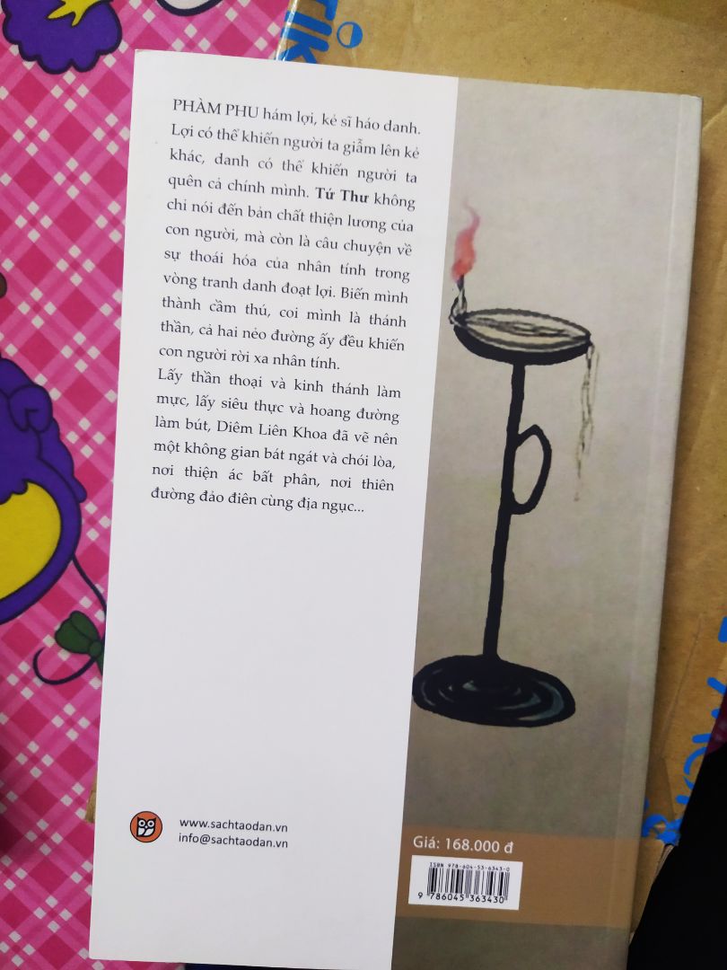 Phàm phu hám lợi, kẻ sĩ háo danh. Lợi có thể khiến người ta giẫm lên kẻ khác, danh có thể khiến người ta quên cả chính mình. Tứ Thư không chỉ nói đến bản chất thiện lương của con người, mà còn là câu chuyện về sự thoái hóa của nhân tính trong vòng tranh danh đoạt lợi. Biến mình thành cầm thú, coi mình là thánh thần, cả hai nẻo đường ấy đều khiến con người rời xa nhân tính. Lấy thần thoại và Kinh Thánh làm mực, lấy siêu thực và hoang đường làm bút, Diêm Liên Khoa đã vẽ nên một không gian bát ngát và chói lòa, nơi thiện ác bất phân, nơi thiên đường đảo điên cùng địa ngục.