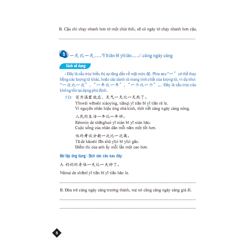 LỜI NÓI ĐẦU Sau lần hợp tác đầu tiên giữa NP BOOKS và tác giả Hạ Bắc Sinh, Nhật Phạm, chúng tôi xin trân trọng giới thiệu một siêu phẩm mới tiếp theo với sự kết hợp giữa thầy Nhật Phạm, một giáo viên với nhiều năm kinh nghiệm sử dụng, giảng dạy ngôn ngữ và biên soạn sách tiếng Trung và thầy Hạ Bắc Sinh, một thầy giáo Trung Quốc được xem như một chuyên gia ngôn ngữ này với hiểu biết uyên thâm và tiếng mẹ đẻ của mình. Với mong muốn giúp đỡ những người tự học có thể dễ dàng lắp ghép câu, sử dụng cấu trúc dễ dàng hơn so với việc học sâu vào ngữ pháp. Cuốn sách được chúng tôi gọi tên “ TUYỂN TẬP CẤU TRÚC CỐ ĐỊNH TIẾNG TRUNG ỨNG DỤNG” này được biên soạn nội dung rõ ràng, mạch lạc theo hướng cầm tay chỉ việc, từ cấu trúc đến giải thích cách sử dụng, bài tập ví dụ đều rất dễ hiểu, dễ áp dụng thức tế và ứng dụng cao. Các nhóm cấu trúc được phân loại rõ ràng, gần 600 cấu trúc này trải đều cho cả GIAO TIẾP, VIẾT LUẬN, BIÊN PHIÊN DỊCH từ cơ bản đến nâng cao. Người học hoàn toàn có thể tự học theo định hướng biên soạn của các tác giả. Chúng tôi tin rằng, với kinh nghiệm học và dạy học của thầy Nhật Phạm trong nhiều năm cũng như sự uyên thâm, am hiểu sâu sắc về ngôn ngữ mẹ đẻ của thầy Hạ Bắc Sinh sẽ mang lại một cuốn sách ứng dụng hiệu quả thực tiễn sử dụng ngôn ngữ của người học Việt Nam. NP BOOKS xin cam kết sách được kiểm duyệt tỉ mỉ từ phần phiên âm từ vựng đến tính bản ngữ của cách diễn đạt, ví dụ ứng dụng, tuyệt đối không sử dụng theo cảm quan và hoàn toàn bám sát tính bản ngữ, tiêu chuẩn của ngôn ngữ Trung Quốc. NP BOOKS xin chân thành cảm ơn thầy Nhật Phạm, thầy Hạ Bắc Sinh và những cộng sự hỗ trợ biên tập Nguyễn Hà Nhiên, Nguyễn Thu Hương, Dương Ngọc Thảo và Nguyễn Thu Hằng đã kết hợp với nhau để tạo ra một sản phẩm có ích cho người học tiếng Trung. Trong quá trình biên soạn, có thể vẫn tồn tại những sai sót, mong quý độc giả đóng góp ý kiến để cuốn sách được hoàn chỉnh hơn trong lần tái bản sau.