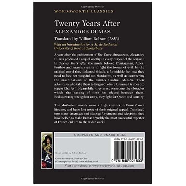 Thông tin sản phẩm : Tác giả: Alexandre Dumas Nhà Xuất bản : Wordsworth Editions Ltd Nhà phát hành: Wordsworth Editions Ltd Năm xuất bản: 2009 Ngôn ngữ : Tiếng Anh Số trang: 686 ISBN: 9781840221633 Nội dung: A year after the publication of “The Three Musketeers”, Alexandre Dumas produced a sequel worthy in every respect of the original. In “Twenty Years After” the much beloved D’Artaganan, Athos, Porthos and Aramis reunite to fight the forces of evil. In the original novel they defeated Milady, a formidable foe; now they need to face her vengeful son Mordaunt, as well as countering the machinations of the sinister Cardinal Maụarin. Their adventures also take them to England, where Cromwell is about to topple Charles I. Meanwhile, they must overcome the obstacles which the passing of time has placed between them. Rediscovering strength in unity, they fight for Queen and country. “The Musketeer” novels were a huge success in Dumas’ own lifetime, and have lost none of their original appeal. Translated into many languages and adapted for cinema and television, they have helped to make Dumas arguably the most successful exporter of French culture to the wider world. “Twenty Years After” là phần truyện tiếp theo của ” The Three Musketeers”( Ba chàng lính ngự lâm) PDF EPUB PRC AZW miễn phí đọc trên điện thoại – máy tính, ứng dụng đọc file epub, prc reader, azw reader của tác giả Alexandre Dumas lần đầu xuất bản năm 1845. Cuốn sách nói về sự hội ngộ của 4 anh chàng D’Artaganan, Athos, Porthos và Aramis để chống lại kẻ thù Milady và con trai của mụ là Mordaunt và âm mưu của Hồng y Mazarin để bảo vệ Nữ hoàng và đất nước.