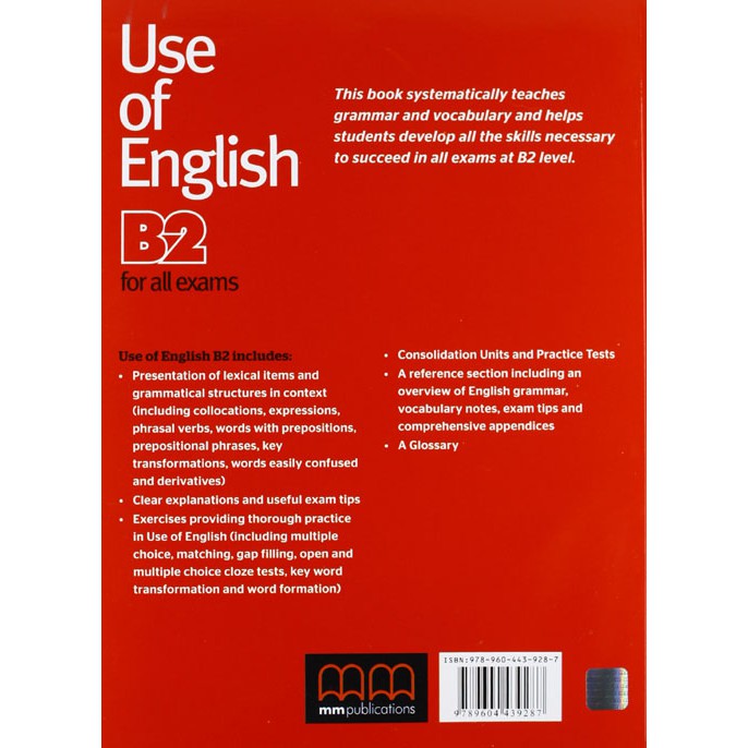 Công ty phát hành: MM Publications Nhà xuất bản: MM Publications Tác giả: E.Moutsou Ngày xuất bản: 01/2016 Kích thước: 21 x 29.4 cm GIỚI THIỆU SÁCH Use Of English B2 trang bị cho người học kiến thức cho kỳ thi chứng chỉ tiếng Anh Cambridge: FCE (Kỳ thi Tiếng Anh trình độ trên trung cấp), Michigan ECCE và các kỳ thi khác bằng cách hướng dẫn và thực hành từng bước. Cuốn sách cung cấp các kiến thức về từ vựng và ngữ pháp một cách hệ thống và giúp người học phát triển tất cả các kỹ năng cần thiết để vượt qua các kỳ thi. Trình độ: CEFR: B2 (Trên trung cấp) Đặc điểm nổi bật: – Từ vựng và cấu trúc ngữ pháp được đặt trong ngữ cảnh (bao gồm cách kết hợp từ, cách biểu đạt, cụm động từ, từ vựng có giới từ đi lèm, cụm giới từ, biến đổi từ khóa, và hình thành từ). – Giải thích cụ thể và lời khuyên hữu ích. – Bài tập luyện tập đa dạng trong cuốn Use of English (bao gồm chọn đáp án đúng, nối từ, điền vào chỗ trống, câu hỏi mở hoặc nhiều hơn một lựa chọn, biến đổi từ khóa, và hình thành từ). – Kiến thức chắc chắn. – Tài liệu tham khảo bao gồm tổng quan về ngữ pháp và từ vựng tiếng Anh, lời khuyên khi thi và bố cục hợp lý. Use Of English B2 provides students preparing for the Cambridge English: First (FCE), Michigan ECCE and other exams with step-by-step guidance and practice.It systematically teaches grammar and vocabulary and helps students develop all the skills necessary to succeed in the examinations. Level: CEFR: B2 (Upper-Intermediate) Key features: – Presentation of lexical items and grammatical structures in context (including collocations, expressions, phrasal verbs, words with prepositions, prepositional phrases, key word transformations, words easily confused and derivatives). – Clear explanations and useful exam tips. – Exercises providing thorough practice in Use of English (including multiple choice, matching, gap filling, open and multiple choice cloze tests, key word transformation, and word formation). – Consolidation Units. – A reference section including an overview of English grammar, vocabulary notes, exam tips and comprehensive appendices. #mmpublications #bluehorizonbook #ELTbooks #englishbook #booksforkid #sachtienganh #sachnhapkhau #booksforchildren