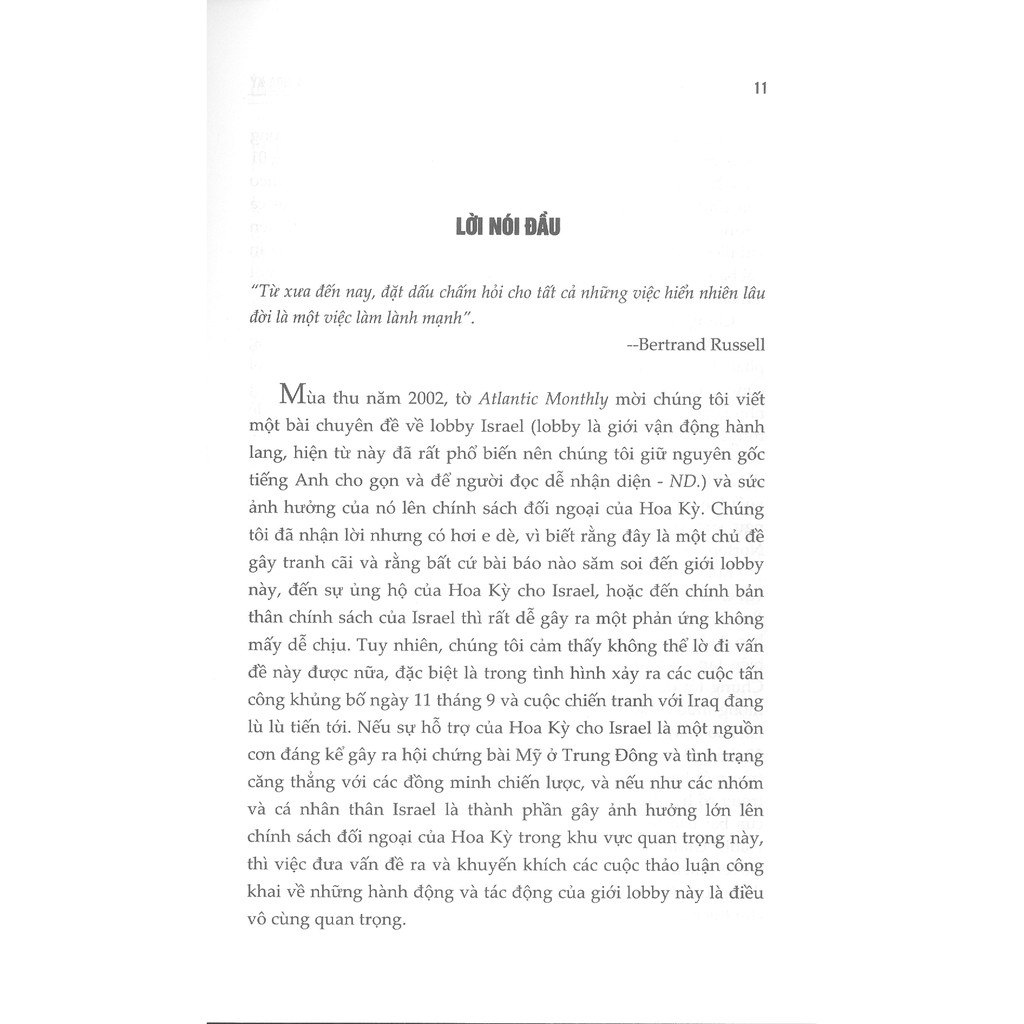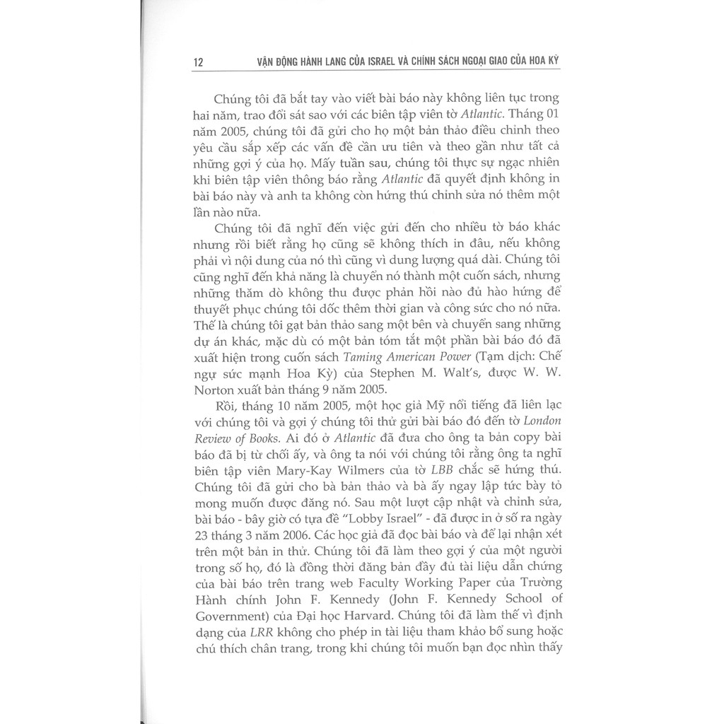 Sách – Vận Động Hành Lang Của Israel Và Chính Sách Ngoại Giao Của Hoa Kỳ Nhà xuất bản: Chính Trị Quốc Gia Tác giả: John J.Mearsheimer Ngày xuất bản: 02-2020 Số trang: 863 Kích thước: 16 x 24 cm Loại bìa: Bìa mềm Nội dung: “Nội dung cuốn sách chủ yếu tập trung vào ảnh hưởng của giới vận động hành lang của Israel lên chính sách đối ngoại của Hoa Kỳ và tác động của nó đến lợi ích của cả hai nước, gồm hai phần chính: Phần I: Hoa Kỳ, Israel và giới lobby, từ Chương 1 đến Chương 6. Nội dung phần này trực tiếp giải quyết vấn đề bằng cách miêu tả những viện trợ kinh tế và quân sự mà Hoa Kỳ đã trao cho Israel cũng như những hỗ trợ về mặt ngoại giao của Washington trong cả hòa bình lẫn chiến tranh; đánh giá những luận điểm chính thường được đưa ra để biện minh hoặc giải thích cho nhiều hỗ trợ ngoại lệ đặc biệt mà Israel nhận được từ Hoa Kỳ, thông qua nghiên cứu những lý lẽ có thể giải thích cho một “mối quan hệ đặc biệt” hiện tại giữa hai quốc gia; xác định những thành phần khác nhau trong giới lobby này và miêu tả quá trình phát triển của mối liên minh lỏng lẻo ấy, đồng thời chỉ ra làm thế nào mà theo thời gian một số tổ chức quan trọng nhất của giới lobby này lại nghiêng về cánh hữu và ngày càng không đại diện cho số đông những người mà họ tuyên bố đại diện; miêu tả những chiến lược khác nhau mà các nhóm trong giới lobby này sử dụng để đạt được lợi ích cho Israel ở Hoa Kỳ; … Phần II: Lobby Israel hành động, từ Chương 7 đến Chương 11. Nội dung phần này cho biết, Hoa Kỳ đã chống lưng cho Israel một cách bền bỉ như thế nào trong nỗ lực đàn áp hoặc hạn chế các nguyện vọng dân tộc của người Palestine; giới lobby Israel, đặc biệt là những người tân bảo thủ trong giới này đã trở thành thế lực chính bẻ ghi con tàu xâm lược tiến vào lãnh thổ Iraq năm 2003 của chính quyền Bush như thế nào; miêu tả diễn tiến của mối quan hệ khó khăn giữa Hoa Kỳ và chế độ Assad ở Syria; tìm kiếm dấu vết của giới vận động hành lang trong chính sách của Hoa Kỳ với Iraq;… Và cuối cùng, trên cơ sở đó, tìm hiểu những biện pháp để cải thiện tình hình u ám bằng cách xác định các lợi ích cốt lõi của Hoa Kỳ ở Trung Đông, phác thảo ra những nguyên tắc cơ bản cho một chiến lược được gọi là cân bằng khơi xa để có thể bảo vệ những lợi ích này hiệu quả hơn và đưa ra nhiều gợi ý điều chỉnh sức mạnh của giới lobby này nhằm đem lại lợi ích cho cả Hoa Kỳ và Israel. *Vận động hành lang (lobby) là thuật ngữ đang được sử dụng khá phổ biến và rộng rãi ở nhiều nước trên thế giới, miêu tả những nỗ lực tiếp cận, thiết lập quan hệ với các nhà hoạch định chính sách của một người hay một nhóm người, nhằm gây ảnh hưởng lên một quyết định hoặc chính sách nhất định của chính phủ để bảo vệ và tối đa hóa lợi ích của nhóm người đó.”
